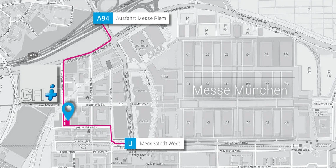 U7 Station Messestadt West aussteigen. Dann Graf-zu-Castell-Str. rechts, in Richtung POLIZEI gehen bis zur Werner-Eckert-Str., dieser links folgen bis zur Paul-Wassermann-Str. Das Eckhaus Werner-Eckert-Str/Paul-Wassermann-Str. 15 ist die GFI. Gesellschaft für medizinische Information.